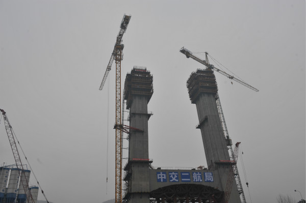 早春二月,长江边上寒风袭人,伍家岗长江大桥工地现场施工却是一片火热。在南岸工地,主塔塔柱已完成至75米,接近整个主塔高度的一半,南岸重力锚基础混凝土浇筑已完成30%,累计完成浇筑1.4万立方米。工人们正在进行钢筋作业,为下一步浇筑做准备。调研组要求,伍家岗长江大桥是宜昌建设内中外环三级快速路环网的控制性节点工程,各参建单位要围绕7月底前完成主塔施工、12月底完成基准索股架设的目标,稳扎稳打,久久为功,为2020年底达到通车条件奠定坚实基础。