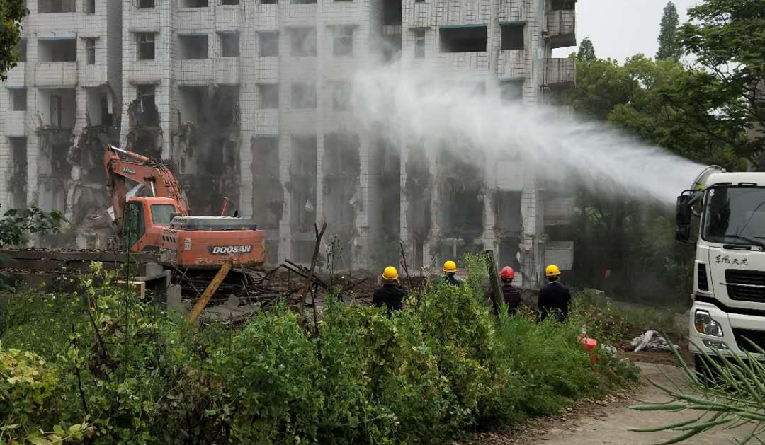 随着一声令下,挖掘机、雾炮车同时作业,拆除现场一片繁忙,已经腾空的房屋被逐步拆除。