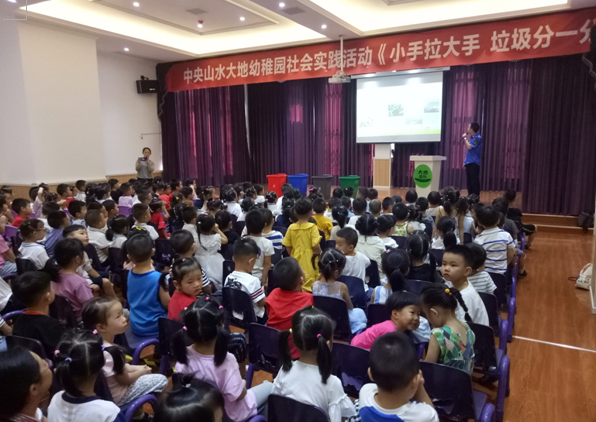 2019年9月11日在学校正式开学的第二周,枝江市城乡垃圾指挥部办公室联合枝江市团市委、枝江市教育局启动并开展垃圾分类进校园活动,主题围绕“小手拉大手、垃圾分一分”重点开展宣传。这次活动首站是中央山水大地幼稚园,共300余名师生参加。