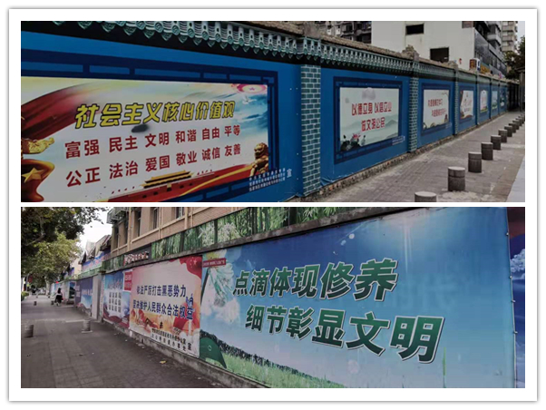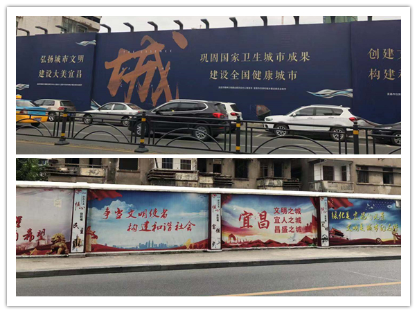 “绿化是宜昌的风景,文明是宜昌的名片”、“弘扬城市文明,建设大美宜昌”……这些公益标语在环城南路、商校征收项目现场的围挡上随处可见,成为宜昌城区街头一道靓丽的风景。