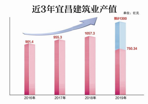 2018年,宜昌建筑业产值1057.34亿元,同比增长10.8%,迈进全市千亿产业行列,建筑业一跃而升成为我市支柱产业。