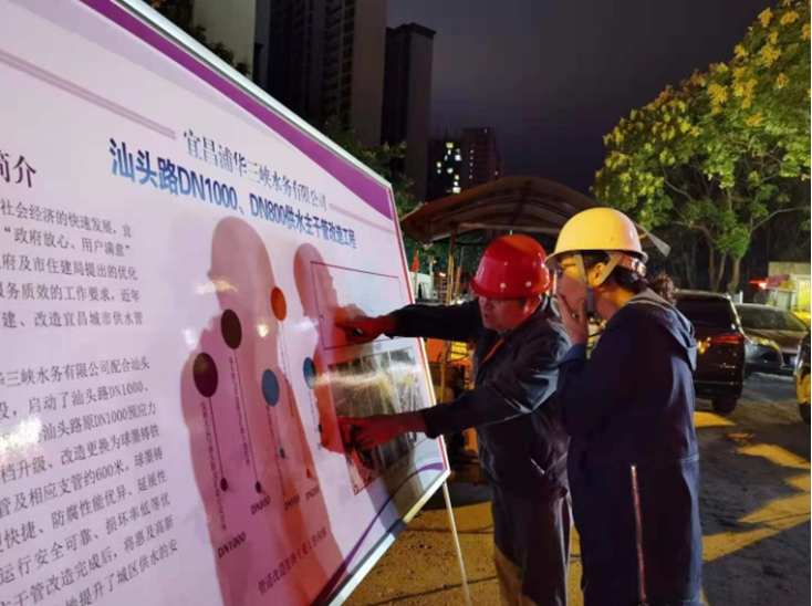 施工期间,多种方式提供临时应急供水,保障停水区域居民生活用水。如:供水企业、各营业所等协同联动,开关调控阀门15处,完成供水调度后,大幅缩小了停水范围,发展大道(四水厂至水悦城)、城东大道(水悦城至葛洲坝中学)等路段区域基本未受停水影响;提高宜昌市三水厂产能,实行反向补水;协调消防、环卫部门,对地势较高停水区域的居民进行送水;三峡浦华水务公司110抢修中心设置临时接水点,满足居民高峰期用水需求。