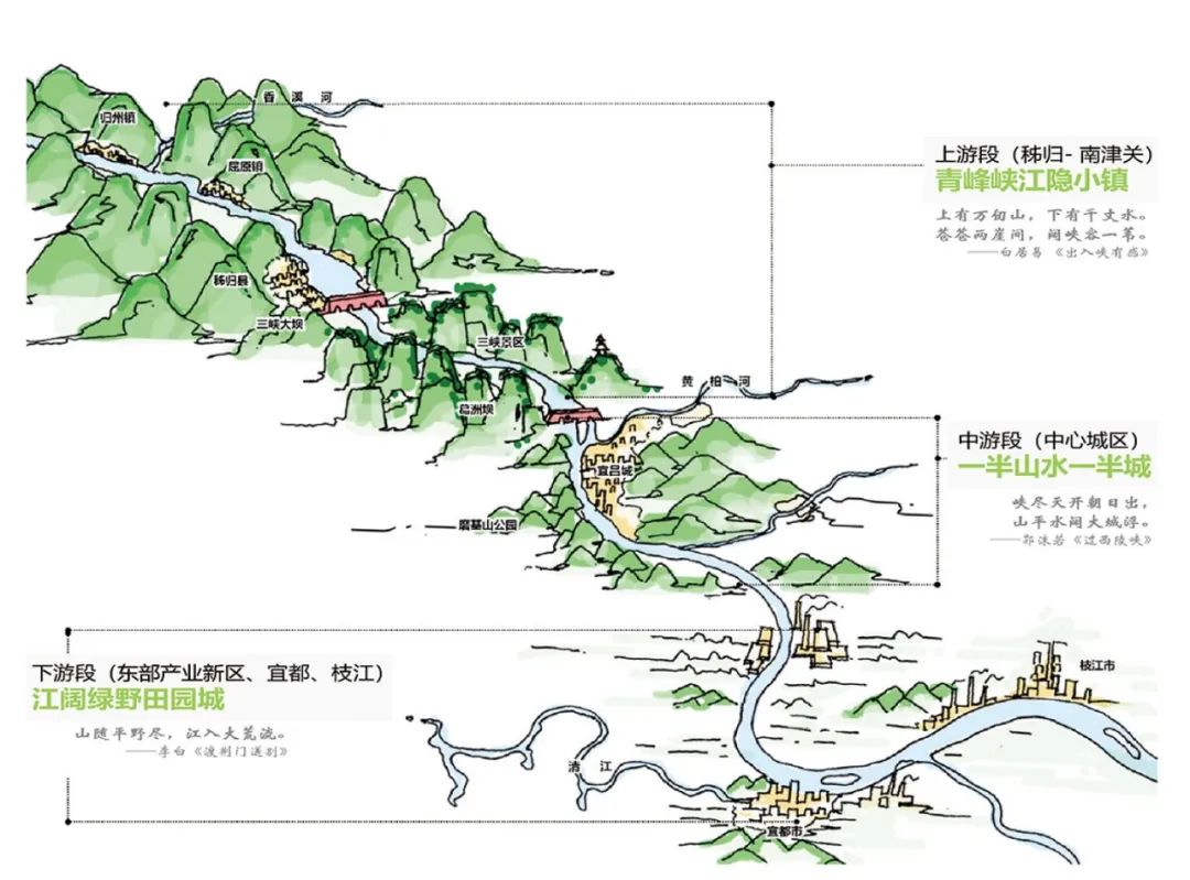 上游段(秭归至南津关),塑造“青峰峡江隐小镇”大美山水风貌,呈现远岭青峰、两崖夹江、小镇隐于山水的景观格局。未来需强化“一江七水、两脉青山”的青峰峡江格局,营造隐于山水的灵动小镇。