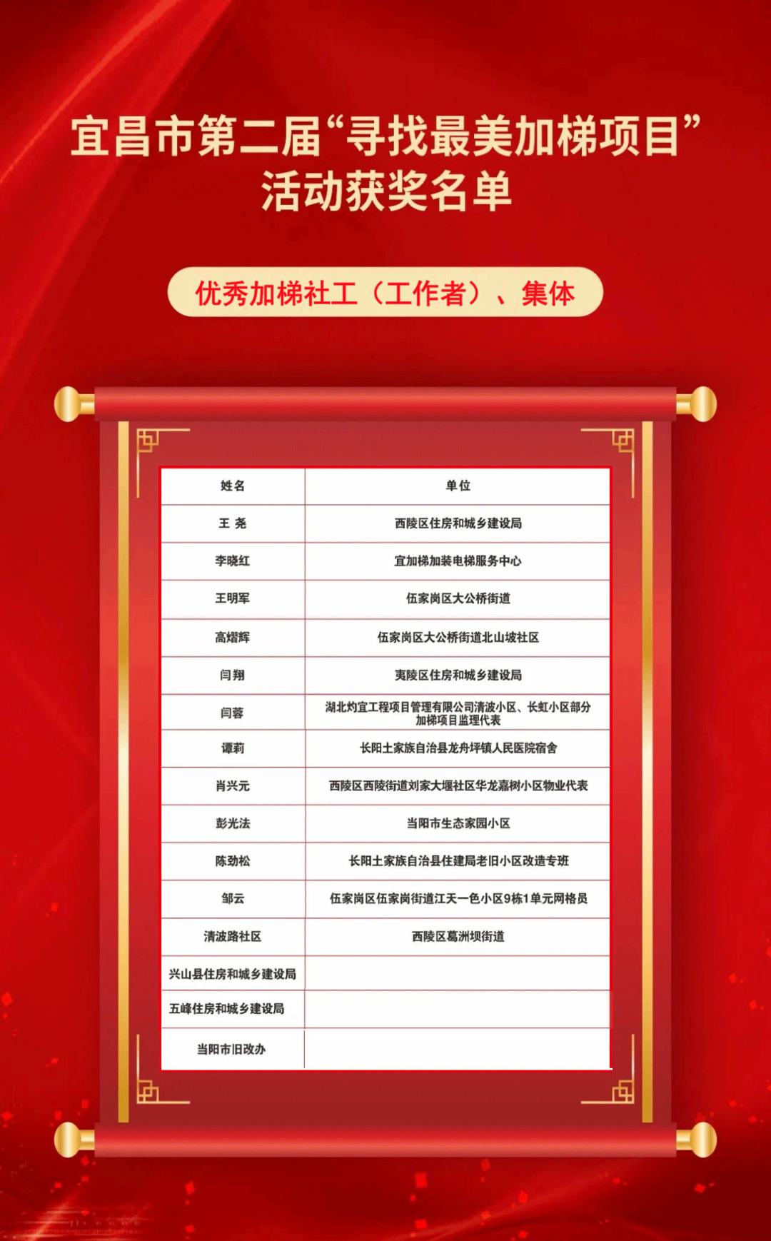 加梯,加幸福!宜昌市第二届“寻找最美加梯项目”活动,经过层层推荐、社会评价、择优确定、审核公示环节,共产生优秀加梯业主(小组)25名,优秀加梯社工(工作者)、集体15名,“最美加梯项目”15 个,“优秀加梯服务企业”9 家。向上生长的幸福感,正在这座城市里不断蔓延。