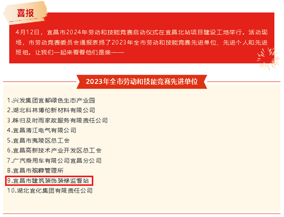 4月12日,在宜昌北站项目建设工地举行的宜昌市2024年劳动和技能竞赛启动仪式上,市劳动竞赛委员会通报表扬了2023年全市劳动和技能竞赛中获奖的10个先进单位、20位先进个人、30个先进班组,市装饰站荣获劳动和技能竞赛先进单位。这是自市装饰站获“五一劳动奖章”“工人先锋号”等荣誉后,再次获得市级表扬。