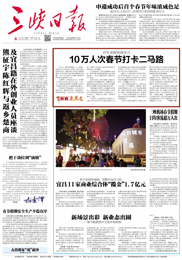 2月4日,春节假期最后一天,宜昌二马路历史文化街区内,前来打卡的市民依然络绎不绝。道路两旁,红色的灯笼高高挂起,将这条百年老街装扮得喜庆而温馨。下沉广场“宜昌”打卡墙旁,等候拍照的市民、游客排起了长队。