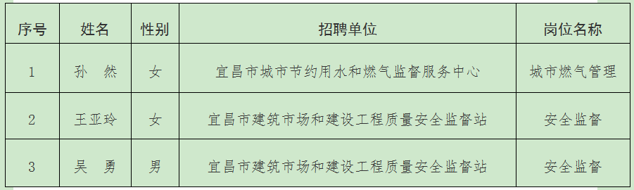 根据《2020年宜昌市住房和城乡建设局所属事业单位急需紧缺人才引进公告》,经过资格审查、面试、体检及考察等程序,拟聘下列人员为宜昌市住房和城乡建设局所属事业单位工作人员,现予以公示。