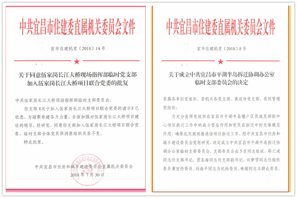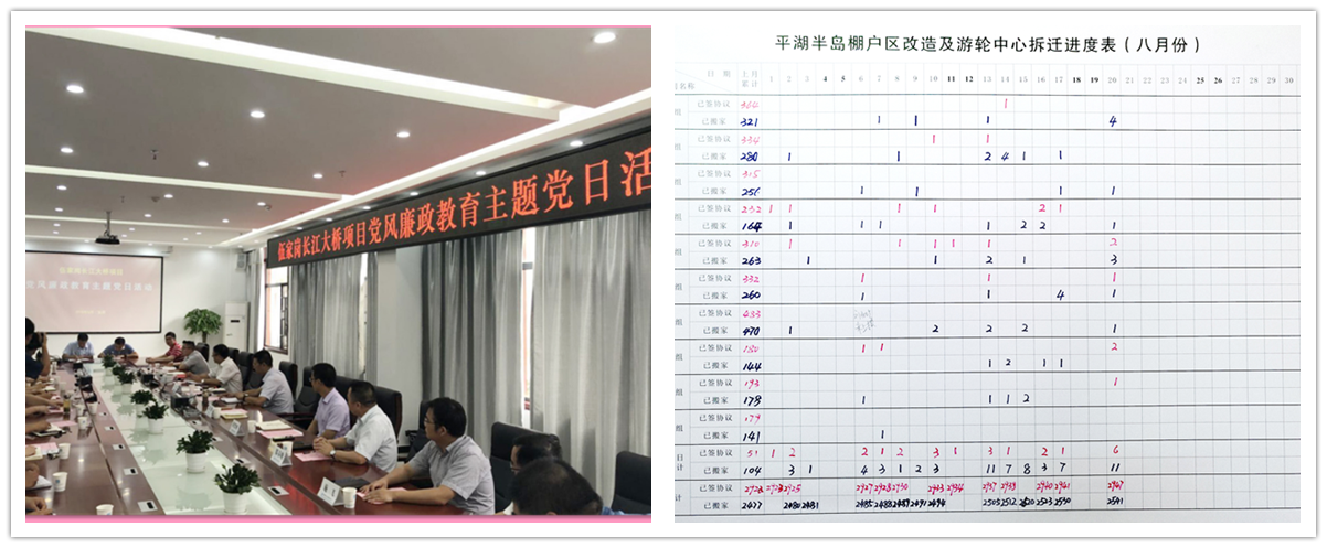 在伍家岗长江大桥、平湖半岛拆迁等项目部成立联合党委、临时党支部,以党建平台夯实工作平台,让党员奋勇冲到第一线,通过“下战书、签军令状”等方式,促进党员竞进作为,较好解决了攻坚不够硬、担当不突出的问题。平湖半岛临时支部自5月成立以来,已签约424户,创8年来历史新高,剩余的90多户年内将全部完成。