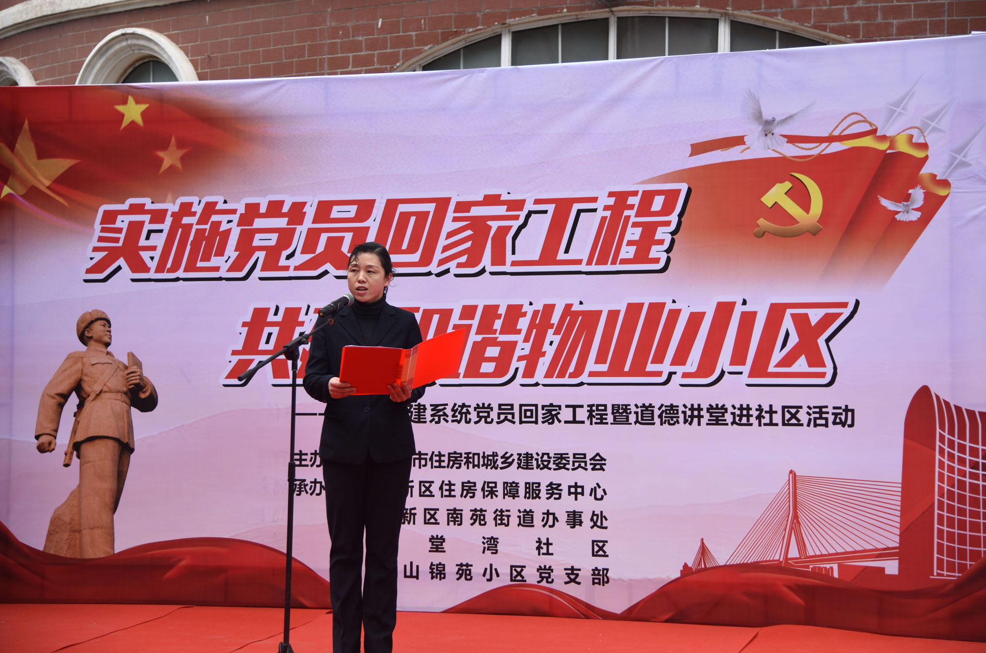 现场宣读市住建系统“实施党员回家工程,共建和谐物业小区”倡议书,号召全体党员在小区中亮出党员身份,以不转移党员组织关系的方式积极主动参加小区党支部活动,发挥党员作用,加强与小区党支部、业委会的沟通,主动建言献策,做到“工作在单位、服务在小区、奉献两不误”。