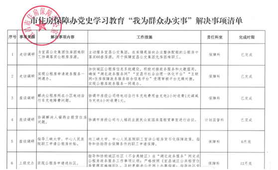 活动中,班子成员及各科室对前期通过走访调研、交流座谈收集的“实现公租房申请进社区”、“开设端口便于群众查询公租房政策”等“我为群众办实事”10项实事进行了认领,并对工作措施进行了明确,对完成时限进行了承诺。