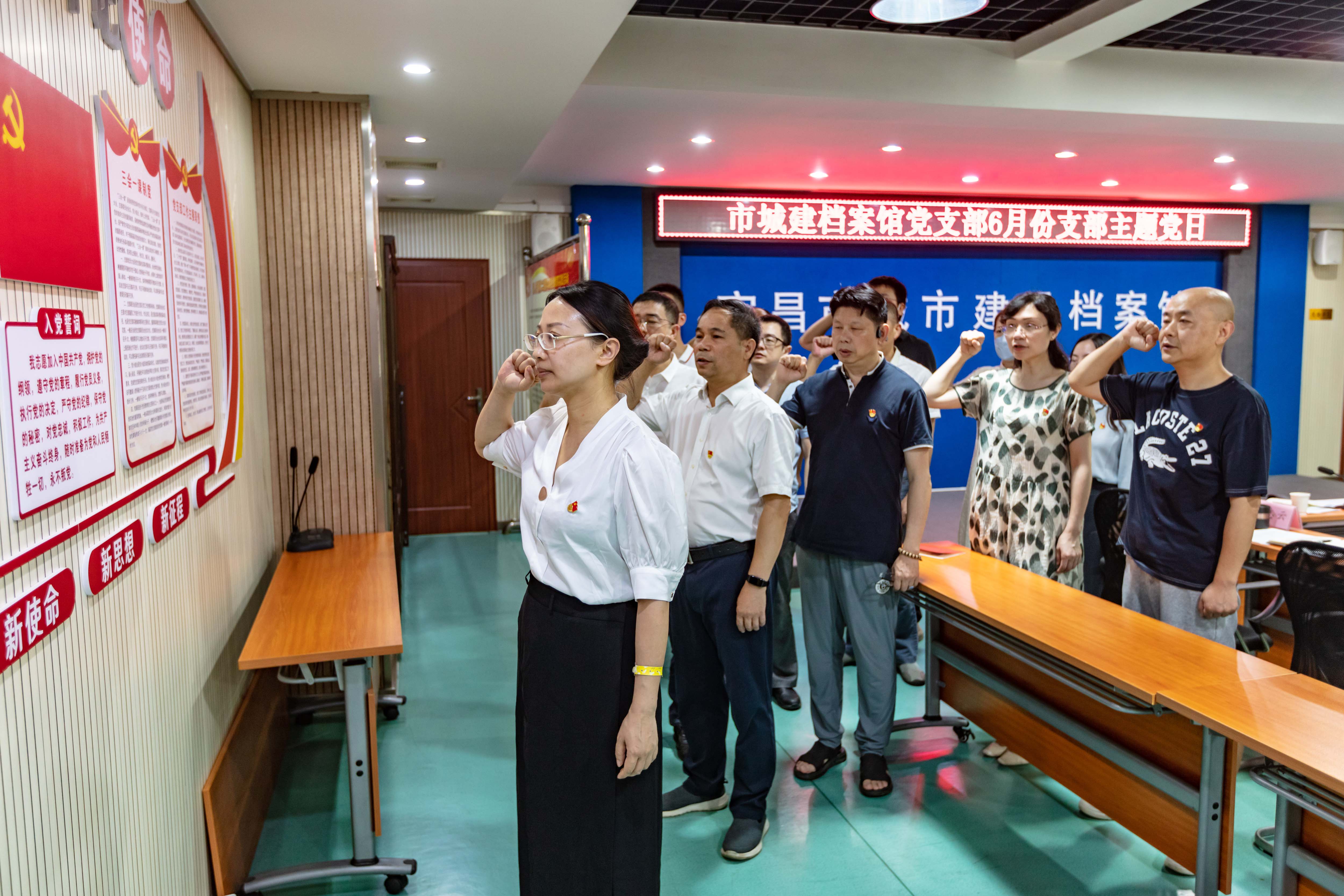 刘溯剑同志与全体党员重温入党誓词,为本月入党的同志过政治生日并赠送党建读物。会议还学习了习近平总书记在文化传承发展座谈会上的重要讲话精神,开展纪法教育进支部,重温《宜昌市入城纪律十条》。