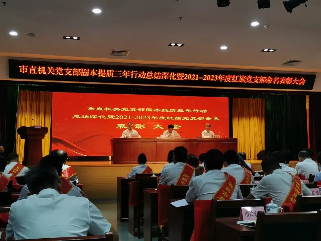 市直机关党支部固本提质三年行动总结深化暨2021-2023年度市直机关红旗党支部命名表彰大会在市委党校举行。会上表彰了79个红旗党支部,市住房保障办党支部、市建筑节能推广中心党支部从市直机关808个在职党支部中脱颖而出,成功晋级。
