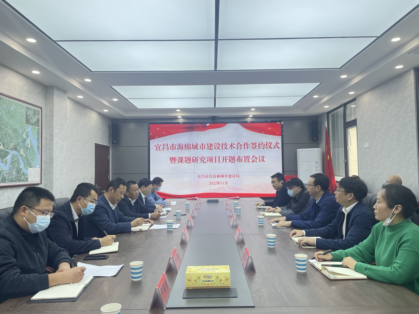 2022年11月25日下午,宜昌市海绵城市建设技术合作签约仪式暨课题研究项目开题布置会议举行,三峡大学水利与环境学院院长彭辉、副院长李卫明,市住建局党组成员、副局长李黎峰等出席会议,市住建局党组成员、总工程师戴大荣主持会议。